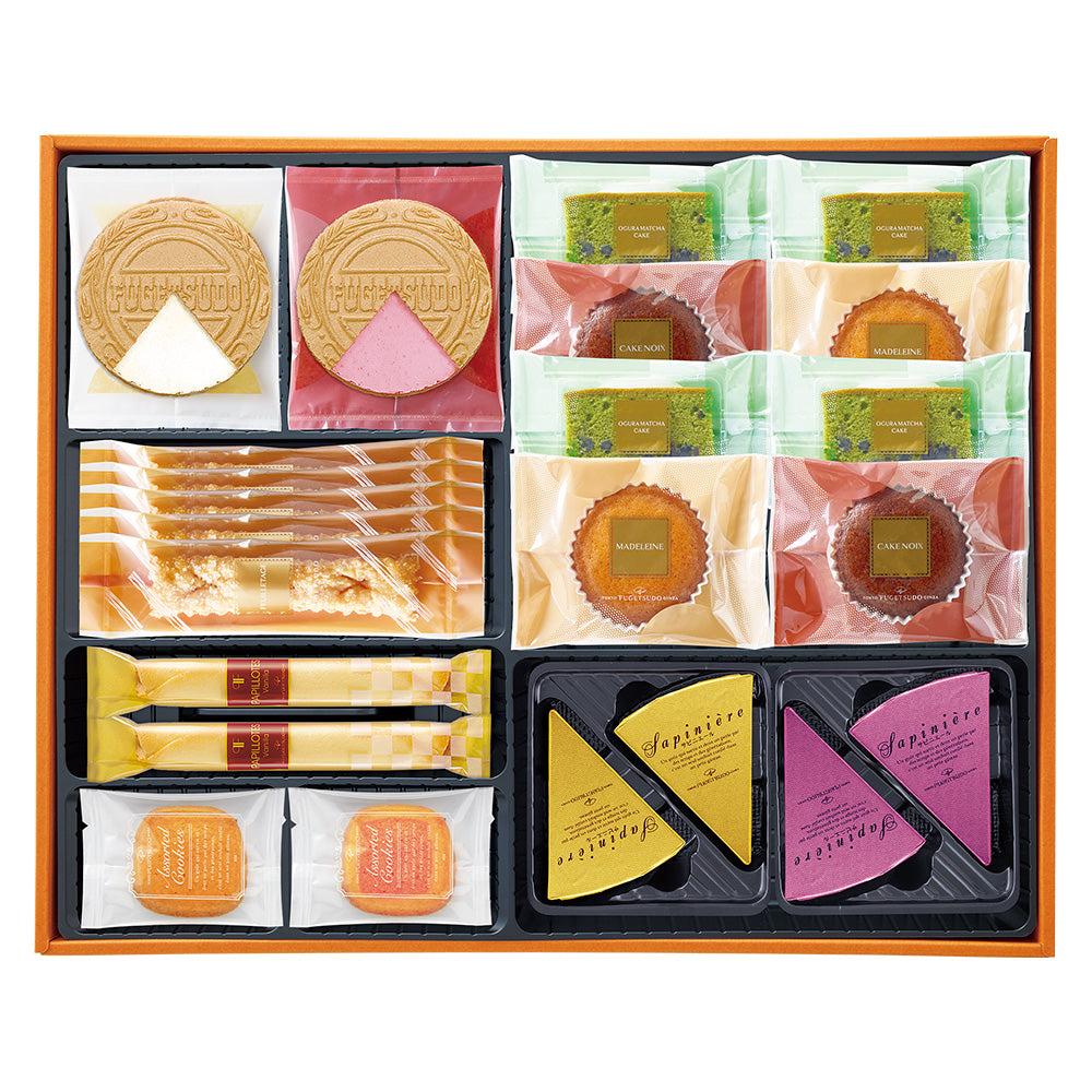 ゴーフレット8枚(バニラ・ストロベリー各4枚)、パピヨット4本、フィユタージュ5枚、アソートクッキー6枚(オレンジ・ストロベリー各3枚)、サピニエール(スイート・苺)各4枚、お菓子の美術館8個(小倉抹茶4個、マドレーヌ・ケークノア各2個)